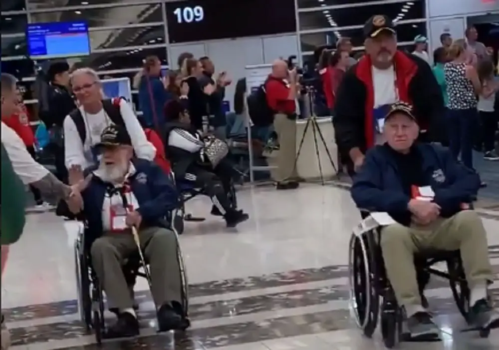 Two dozen Korean War Vets didn’t expect to get so much as a handshake from their pilot and stewardesses when they exited their plane but they got so much more than that.
