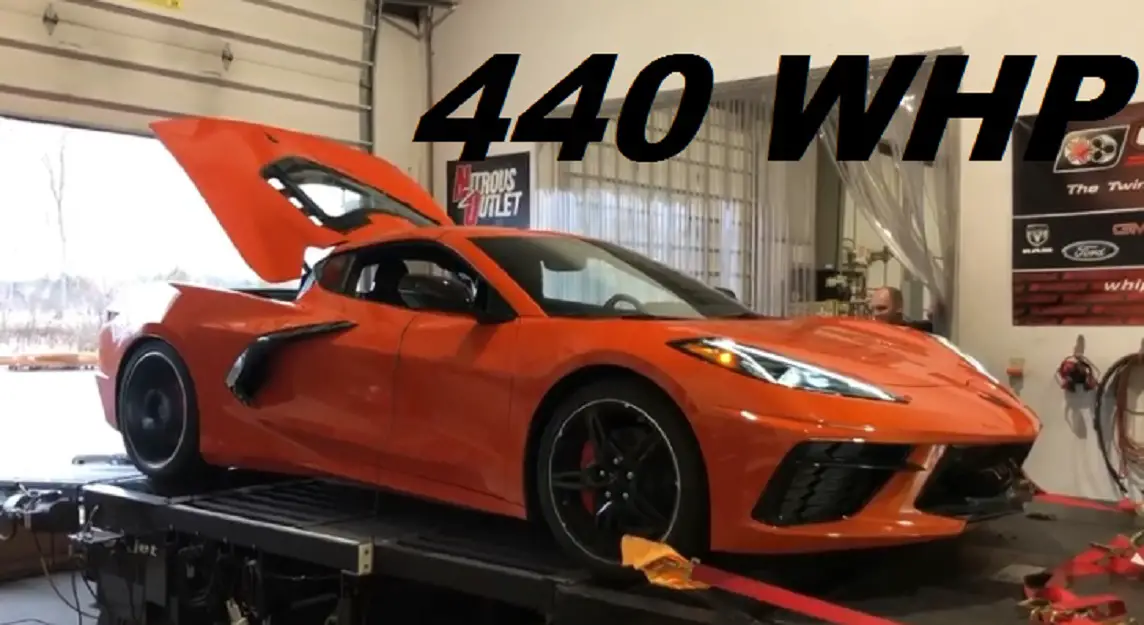 Customers just started taking home their new C8 Corvettes and tuners like Carlyle Racing in Plain City, Ohio are already ripping into them for some serious drag racing. Carlye Racing wrapped up dyno runs on a stock C8 Corvette with just 24 miles on the odometer and already installed a huge bottle of nitrous in the frunk, ready for a drag strip run sooner rather than later.