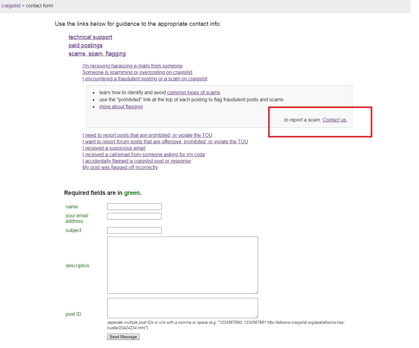 Here’s what Craigslist will tell you and what their Contact page looks like.
