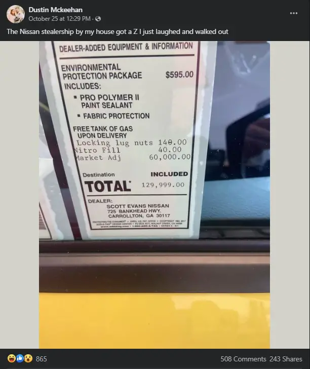 “The New Nissan Z” group member Dustin Mckeehan shared a window sticker on a 2023 Nissan Z Proto Spec displayed at Scott Evans Nissan in Carroll, GA to group members highlighting how much market adjustment they tacked on, an eye-watering $60,000. After a handful of other non-essential add-ons, the total for this 2023 Nissan Proto Z was $129,999.00.