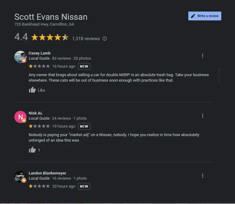 The vitriol for Evans’s smug comment spilled over to Scott Evans Nissan’s Google Reviews, where the Carrollton Nissan dealership’s received 15 one-star reviews and counting over the last 24 hours.