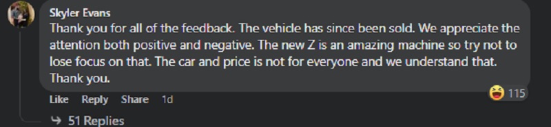 “The vehicle has since been sold. We appreciate the attention, both positive and negative. The new Z is an amazing machine so try not to lose focus on that. The car and price is not for everyone and we understand that. Thank you.”