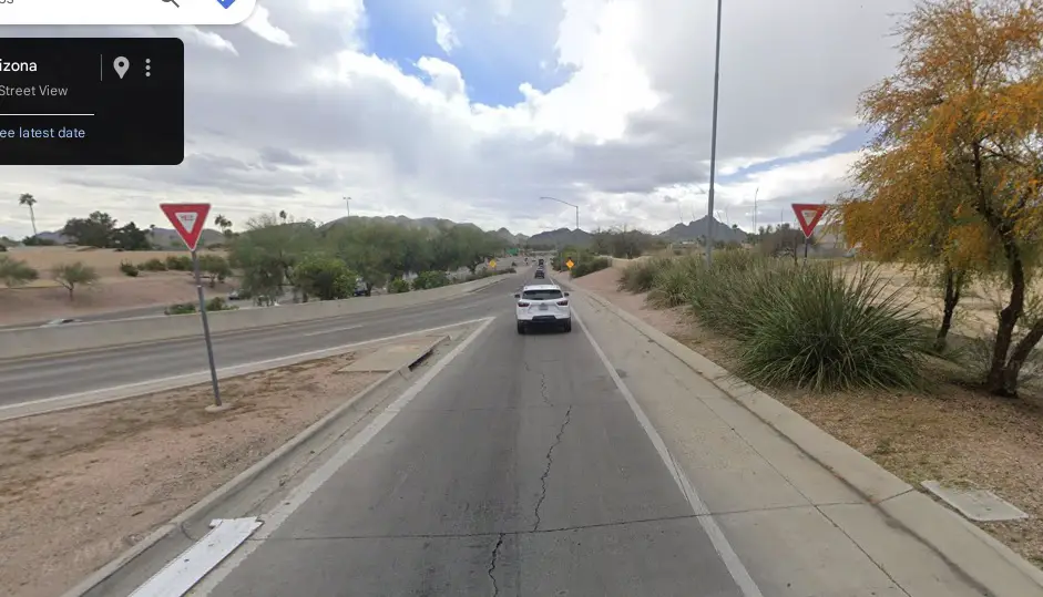 There’s a yield sign, as plain as day, on this 51 South on-ramp from E Cactus Rd, a sign this Tesla owner ignored.