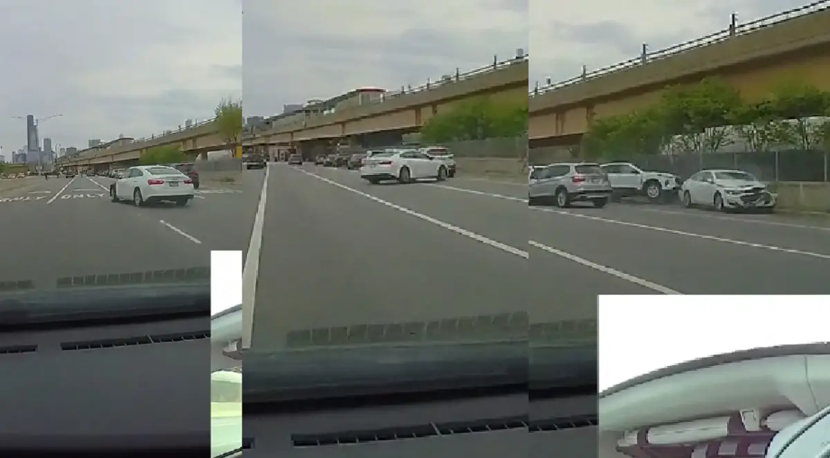 Suddenly, a driver in a Chevrolet Cruze, going at speeds well above 30 MPH, understeers towards the other side of the off-ramp.