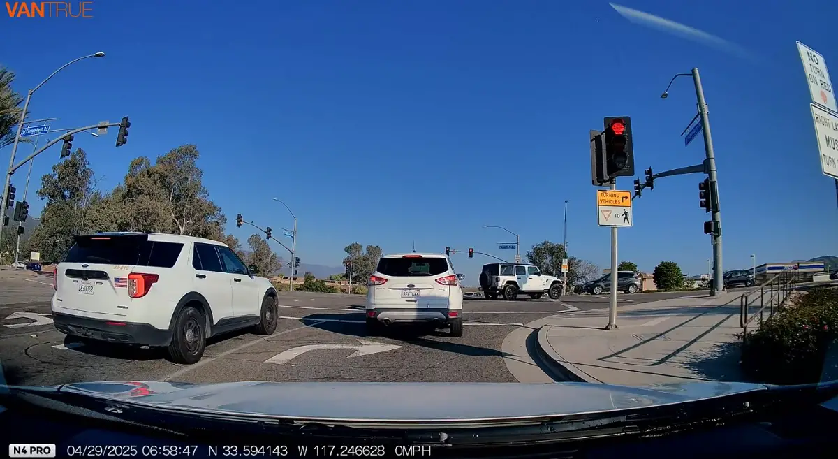 Riverside County commuter and Redditor /u/Most-Road-5366 shared headshaking dashcam footage from Wildomar from earlier last April (April 29, 2025) to the /r/IdiotsInCars subreddit showing a Tesla driver going right on red despite signage prohibiting it and a Jeep driver trying something similar from the wrong right lane, only to get caught.