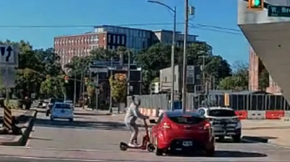 Downtown Richmond area driver and Redditor /u/quantizedd shared headshaking dashcam footage from earlier in October (Oct 4, 2025) showing the brain-dead moment a college-age kid decided it was a bright idea to ride his scooter through a busy intersection against a no-crossing signal.