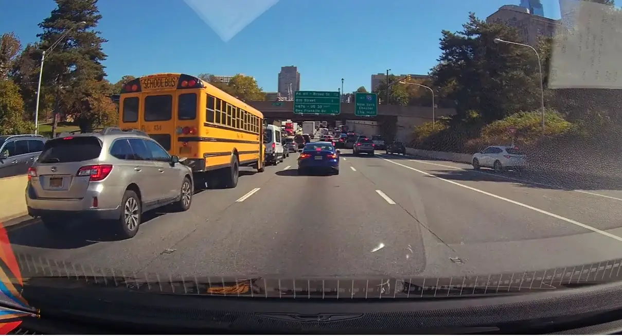Vine Street Expressway commuter and Redditor /u/OverExposedDad shared headshaking dashcam footage from earlier in October (Oct 9, 2025) to the /r/Dashcam subreddit showing an inattentive Subaru driver slamming into the back of a school bus at a relatively low speed.