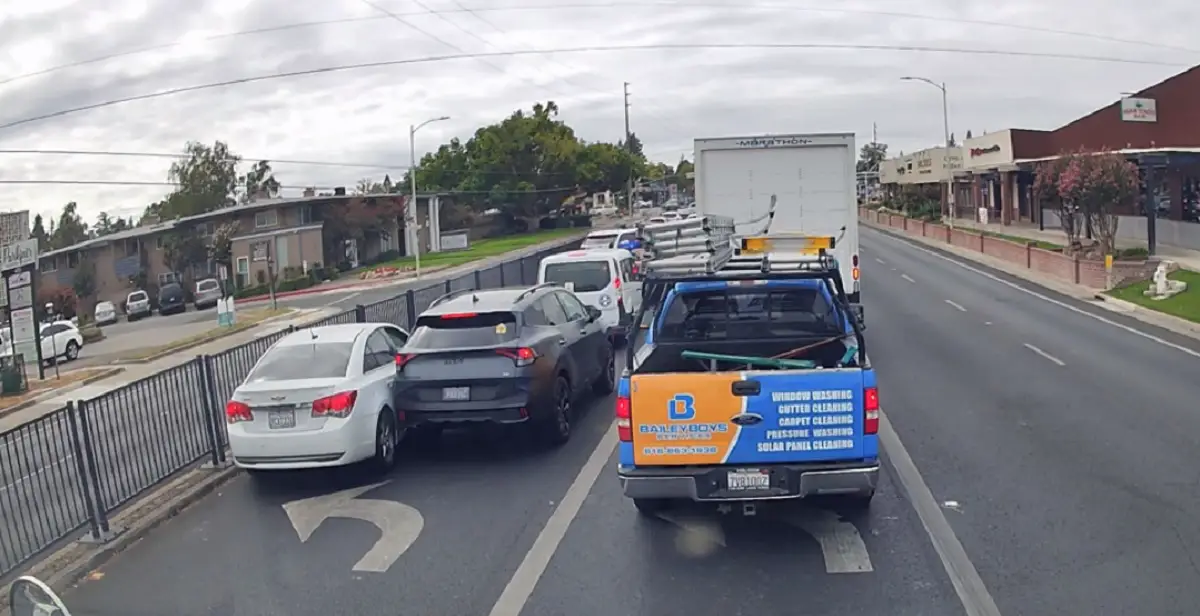 Both drivers roll down their windows to presumably coordinate how they’re going to resolve this, and that’s where the clip ends.