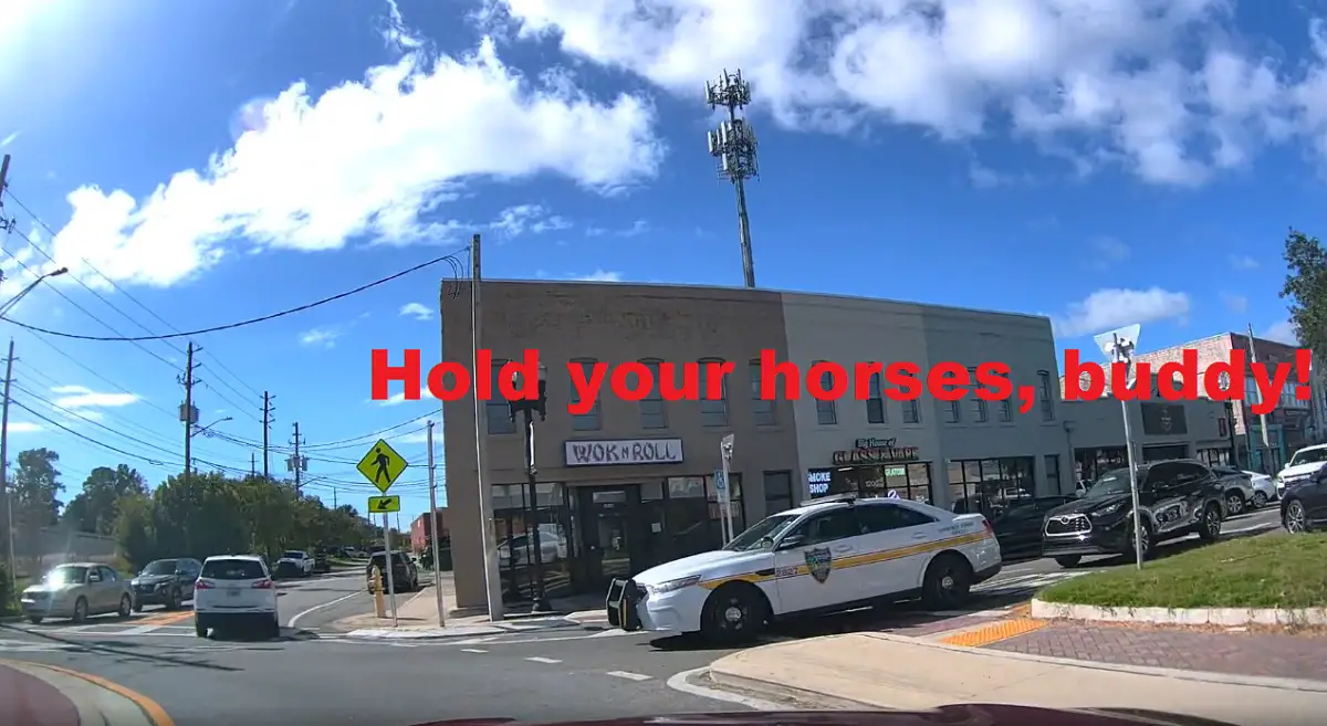 “Anxious to catch up with his buddy, the officer didn’t want to wait for us already in the roundabout. No contact, and he went on his merry way,” OP’s caption reads.