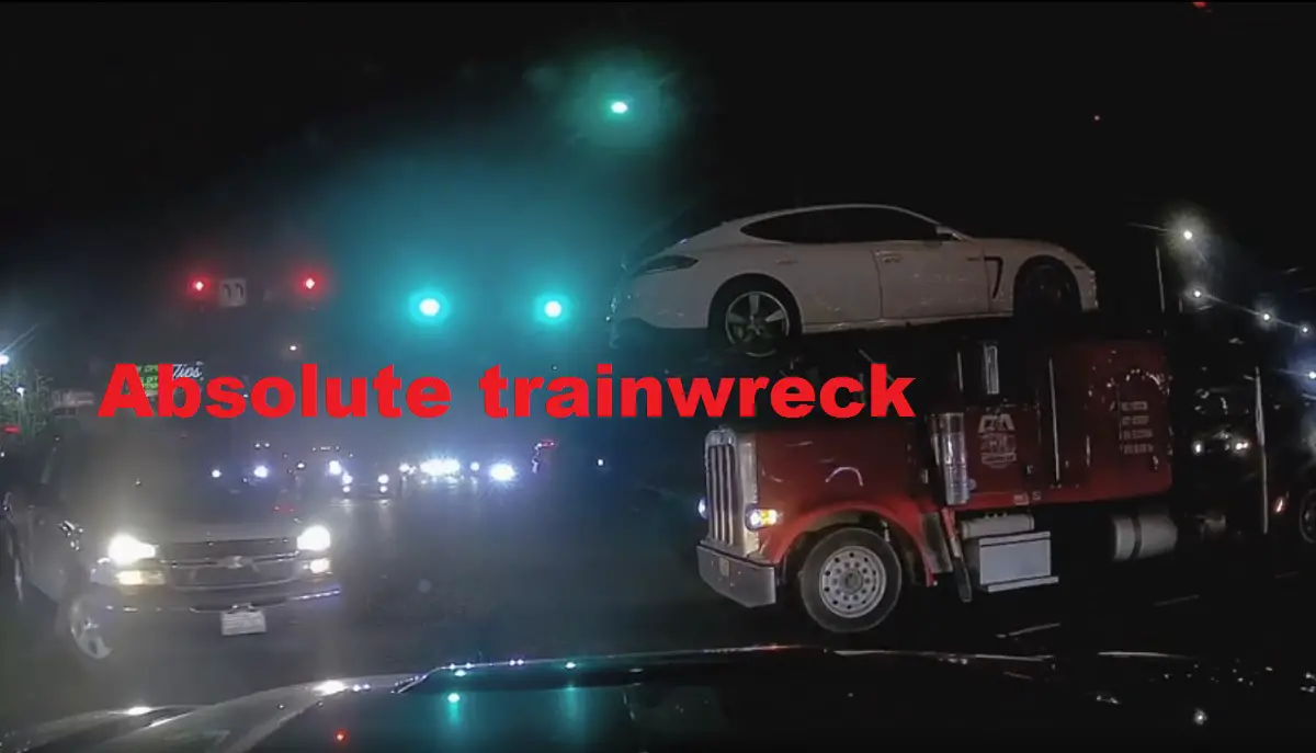 Their green light, however, was super short, and by the time they were supposed to stop, the car hauler was already almost halfway into the intersection.
