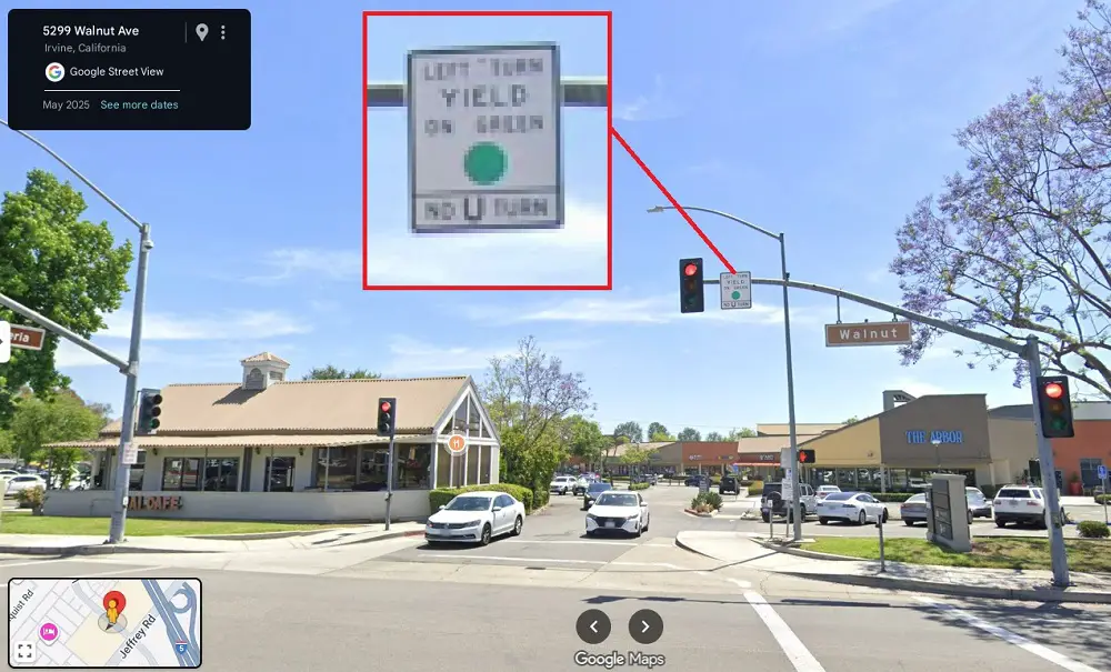 A large sign informs drivers to “Left Turn Yield on Green,” yet these Tesla drivers remained ignorant of that directive.