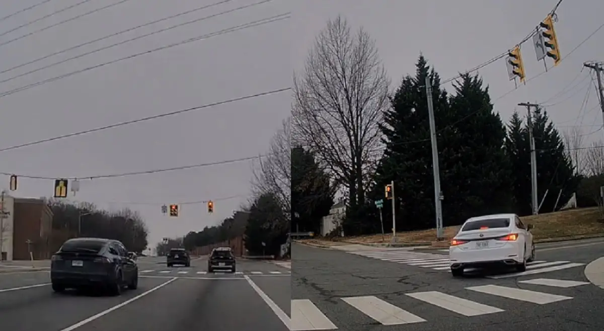A driver in a white Lexus tries to make what’s called a right-right turn to avoid a red light.