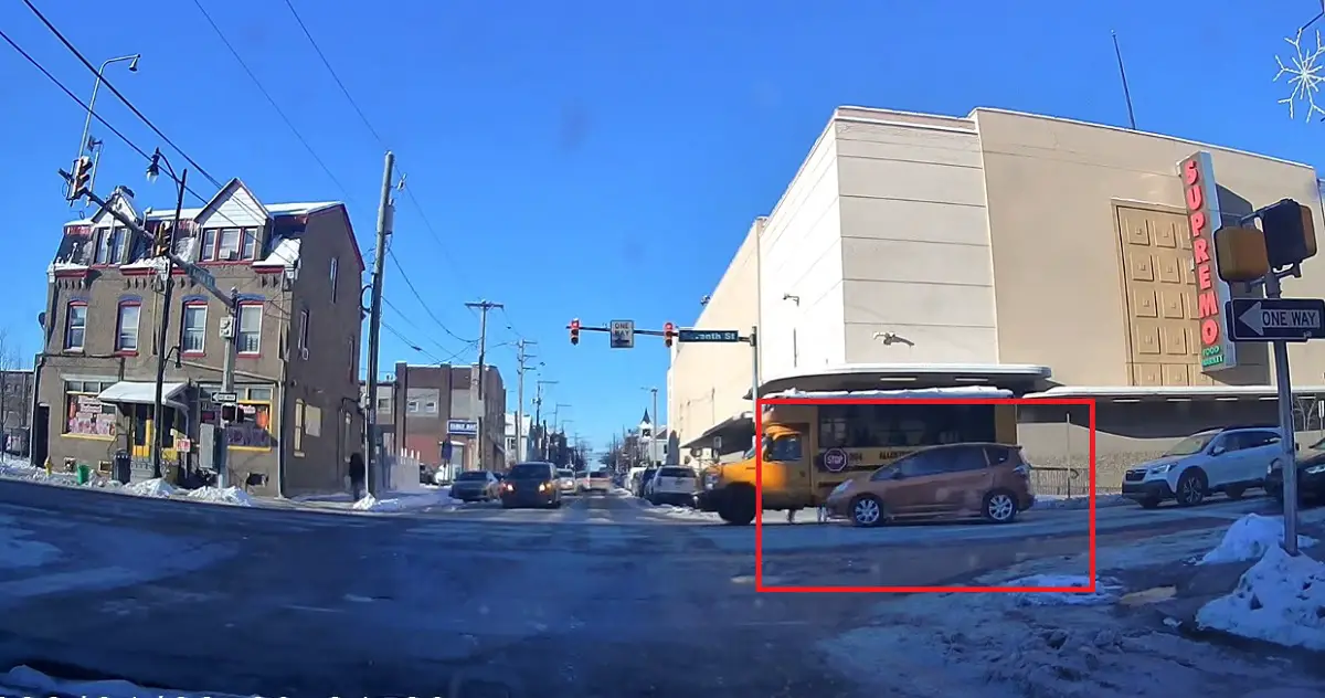 To his right, he starts seeing this harebrained situation play out as a driver in a Honda Fit is brute-forcing their way into a right turn from the wrong lane.