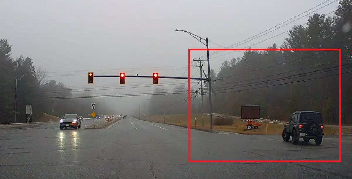 A full vehicle length over the limit line and technically already running the red, the Wrangler driver doubles down on impatience and busts out the infamous right turn, immediate U-turn, followed by another right turn to circumvent the red light.