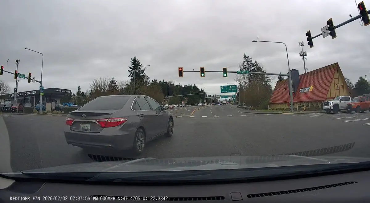 King County driver and Redditor /u/HorseBagel shared headshaking dashcam footage from this busy Burien intersection from earlier in February (Feb 2, 2026) to the /r/IdiotsInCars subreddit showing an impatient driver turn reckless, gunning it from a left turn lane, into opposing traffic, to then cut in and go straight, instead.