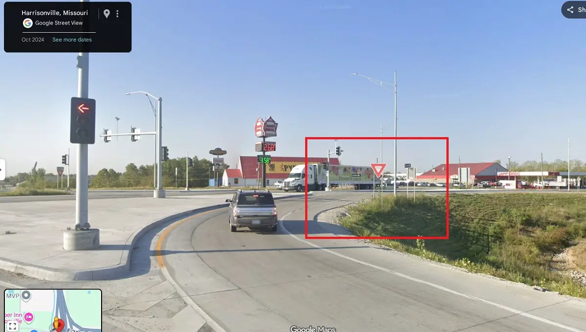 As he approaches an intersection with traffic coming off MO-7 he has to come to a stop because another semi hauling an oversized load barrels through the yield sign sans yielding.