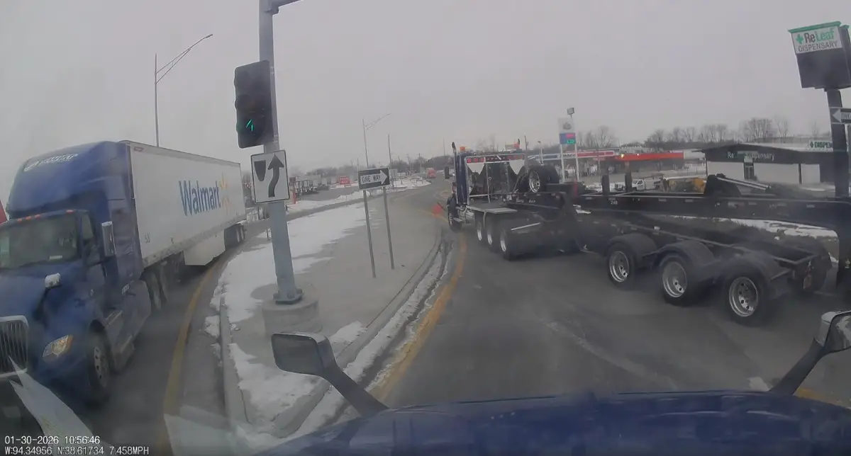 Long-haul trucker and Redditor /u/nomadic_memories shared a somewhat near miss from earlier at the end of January (Jan 30, 2026) to the /r/IdiotsInCars subreddit, showing another semi hauling an oversized load exiting I-49, blowing through a yield sign, causing OP to come to a stop and block traffic, too.