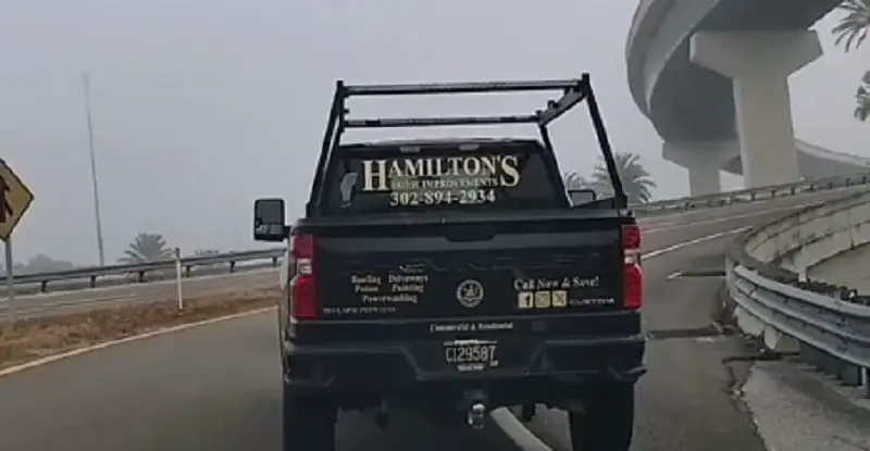 A driver in a company work truck (Hamilton’s Home Improvements 302-894-2934 License Plate C129587) in front of OP is too impatient, unwilling to wait a couple of seconds to pass a slow-merging driver in a Nissan Pathfinder in front of them.