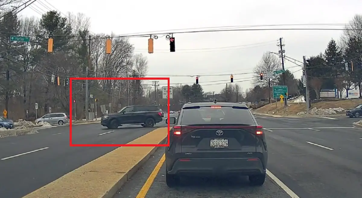 Montgomery County driver and Redditor /u/Pwntastik shared headshaking dashcam footage from earlier in February (Feb 16, 2026) to the /r/IdiotsInCars subreddit showing an impatient driver making their own rules, risking a multi-vehicle accident, just to bypass a red light on their way to making a U-turn.