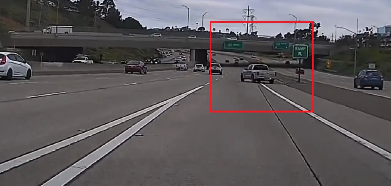 As he approaches the off-ramp to continue on the 163 under Friars Rd, a driver in a silver Dodge Dakota can be seen making their way across the gore point, an area of the freeway not meant to be driven across.