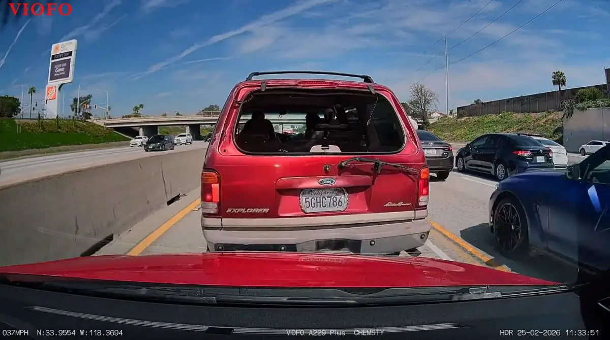A driver with an already smashed-in, damaged rear tailgate darted into the carpool lane without looking because of course they did.