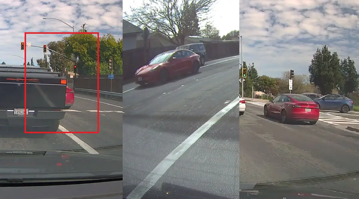 Out of the scene in front of the Cybertruck is a driver in a Red Tesla Model 3 who, the consensus is, realizes they need to get onto 680 S instead.
