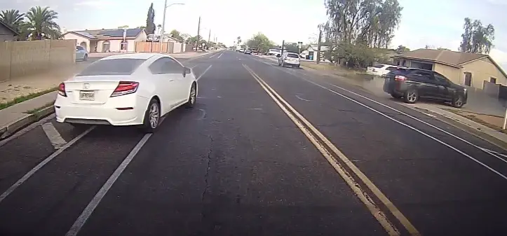 Suddenly, a driver in a white Honda Civic on 43rd Ave with the right of way can be seen making a right turn, except they’ve entered the corner way too fast, causing them to understeer instead of turning.