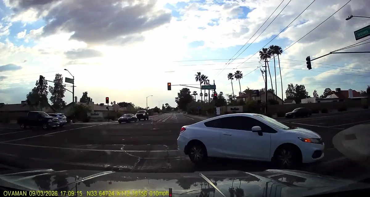 Maricopa County commuter and Redditor /u/AZIPA89 shared headshaking dashcam footage from this busy Glendale intersection from earlier in March (Mar 9, 2026) to the /r/dashcam subreddit showing an erratic and overzealous driver entering a turn way too fast causing them to overshoot into opposing traffic and over a curb before continuing on their merry way.