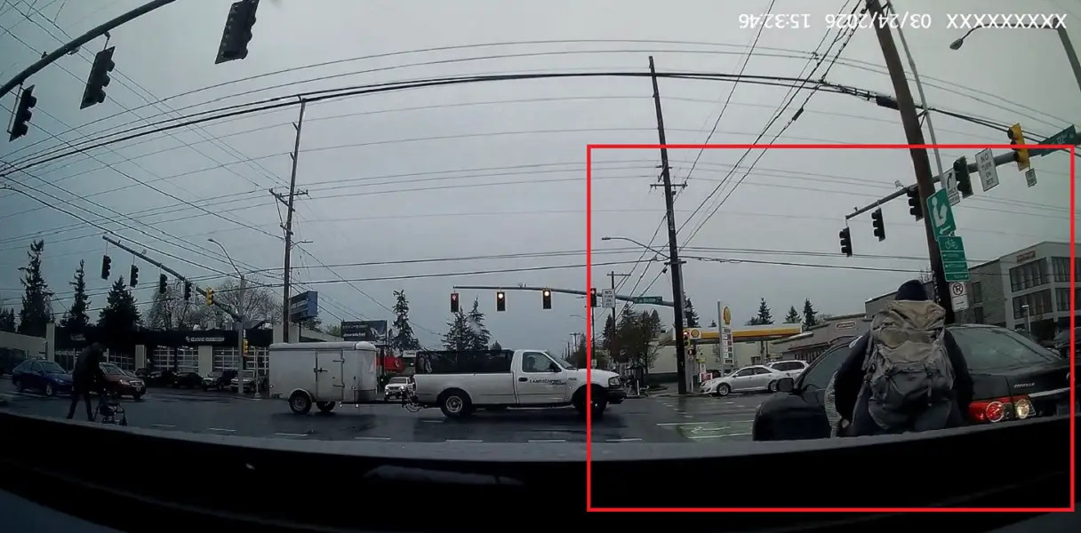 Portland-area commuter and Redditor /u/BaconAccessories shared headshaking dashcam footage from this busy intersection from earlier in March (Mar 24, 2026) showing this careless Grandma in a Toyota Corolla completely blowing past the limit line and almost taking out two pedestrians.