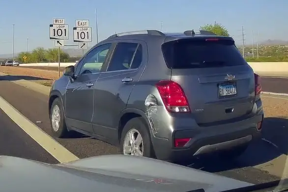 As he drives parallel to the interchange headed towards Loop 101 East, a driver in a Chevrolet Trax (License Plate BX 58412) can be seen drifting towards him from said lane, across a gore zone, which, if you didn’t already know, is not meant to be driven through.
