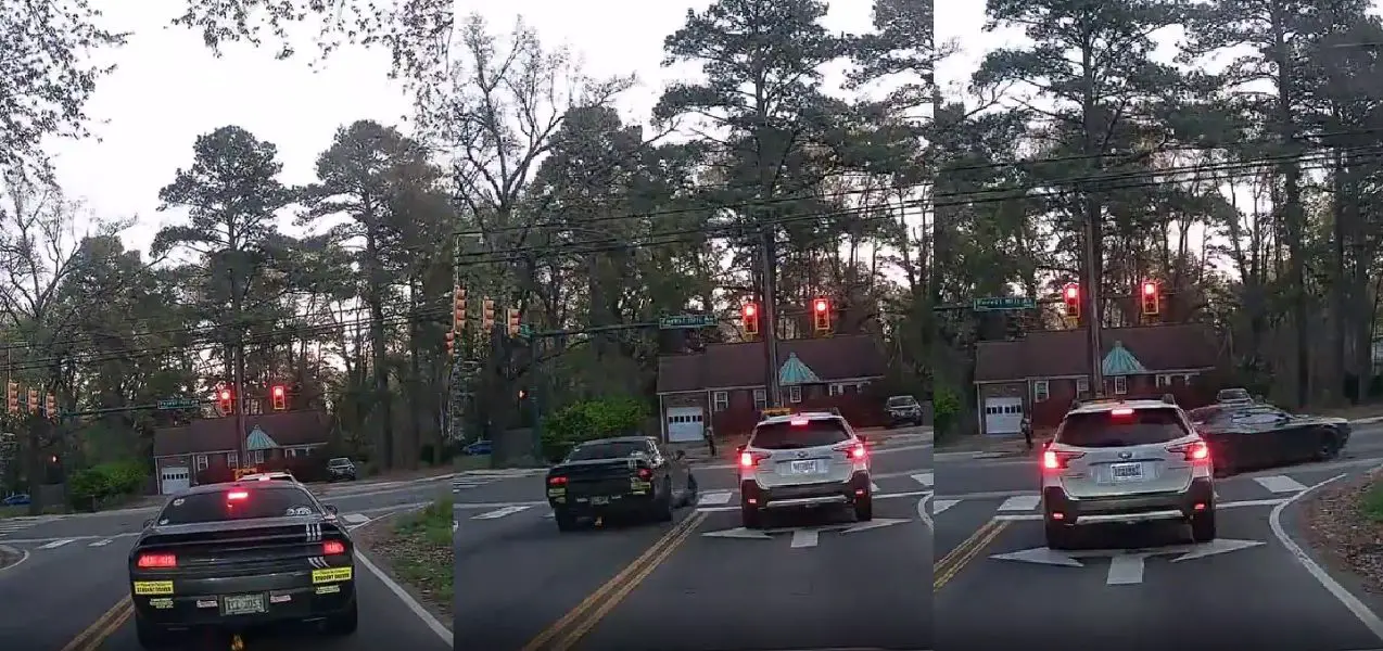 As the dashcam shows both times, a driver in a Dodge Challenger with license plate TCL 2053 comes up to the T-intersection, and instead of waiting for the light to turn green to make their turn, the Challenger opts to first drive into opposing traffic and cut in front of traffic patiently waiting, effectively running the red light.