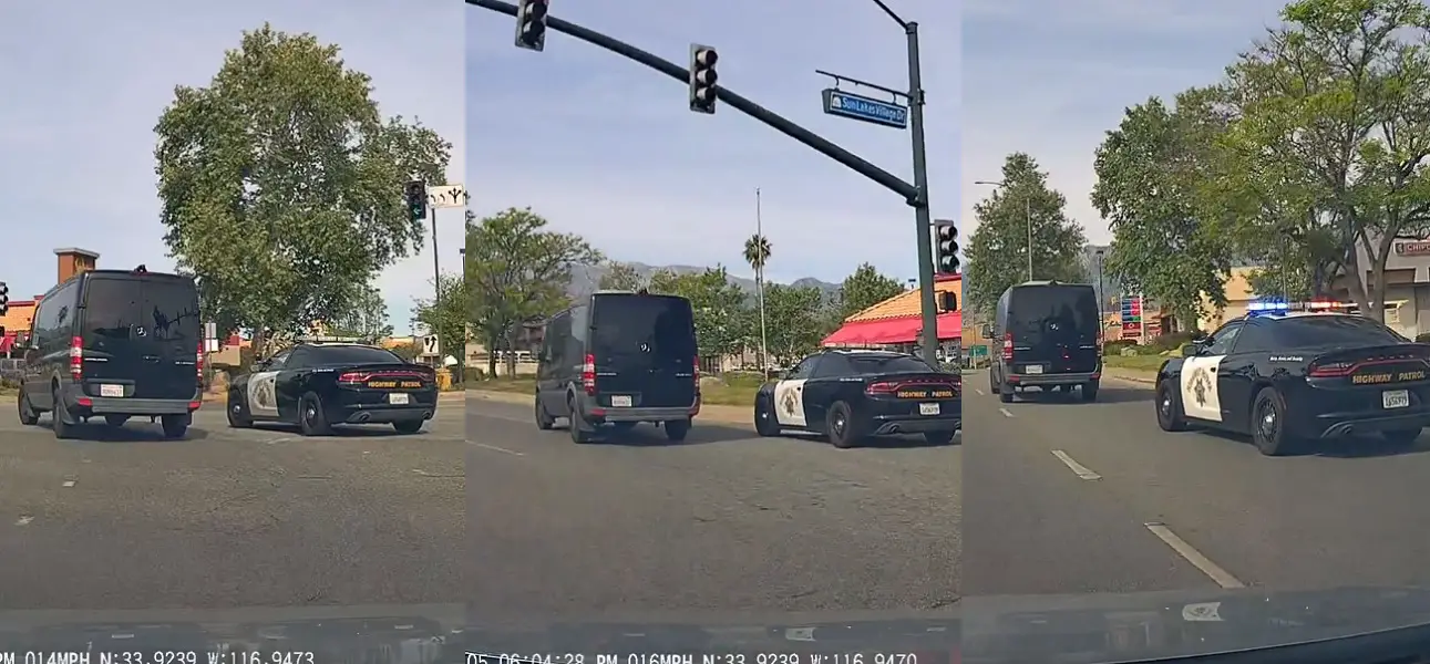 Beaumont-area driver and Redditor /u/YummyPop_ shared headshaking dashcam footage from earlier in April (Apr 5, 2026) to the /r/IdiotsInCars subreddit showing a driver in a Mercedes Sprinter failing to maintain their lane, turning left, and cutting off a CHP officer in the process.