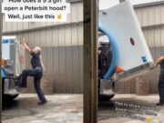 Badass diesel mechanic Chloe Yonker demo’s opening a Peterbilt hood at 5 feet 3...